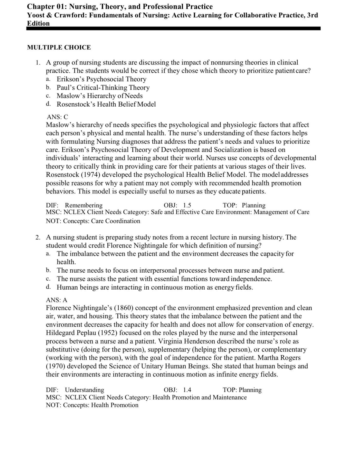 This Test Bank is developed to accompany the 3rd Edition of Fundamentals of Nursing: Active Learning for Collaborative Practice by Yoost.
