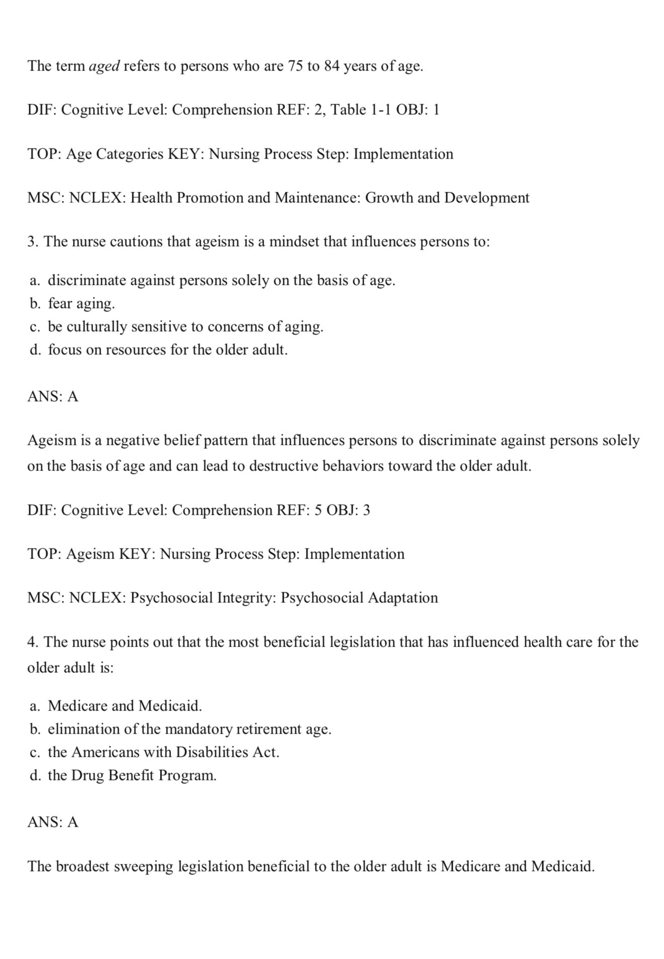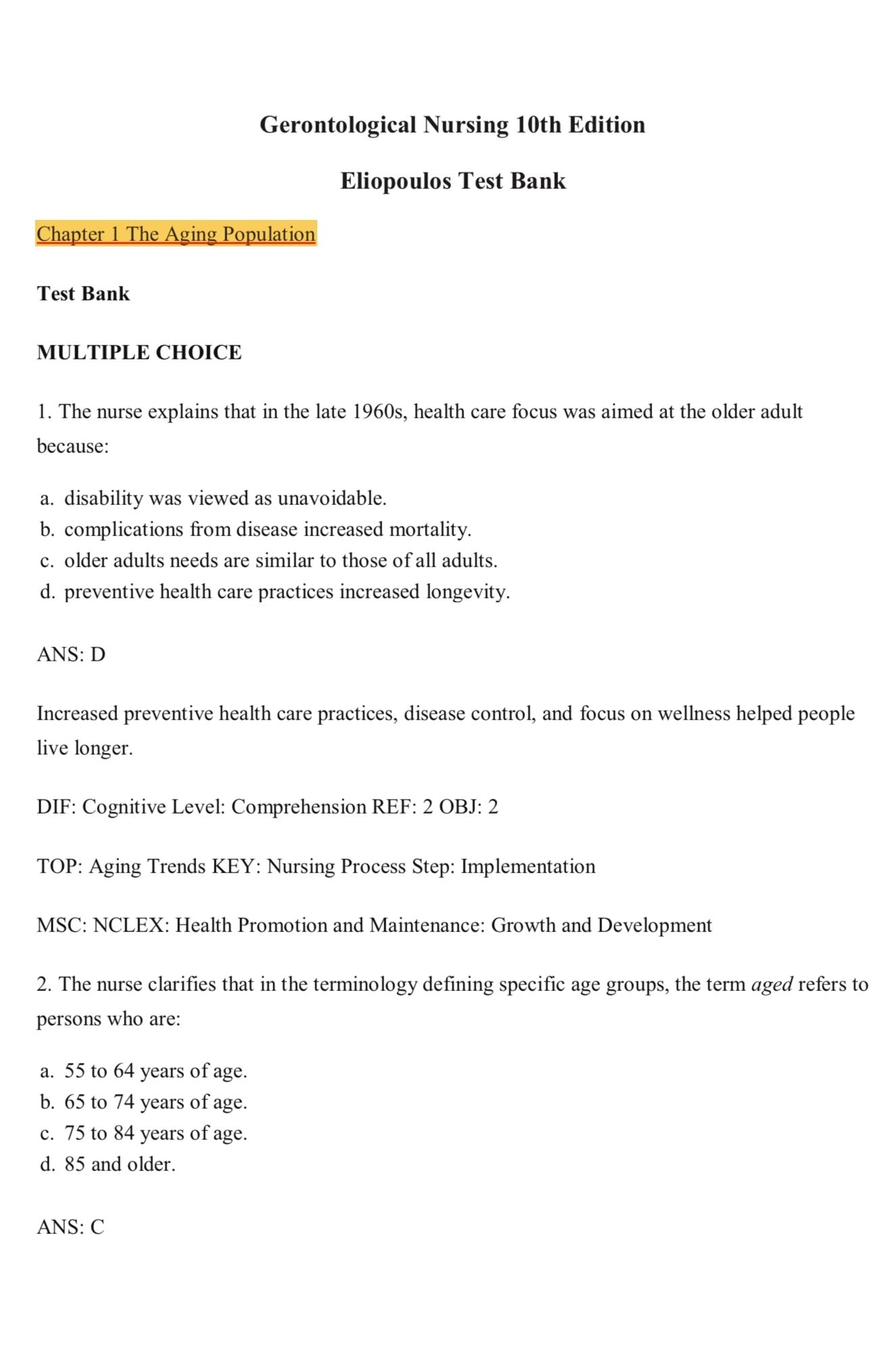 This Test Bank is designed to accompany the 10th Edition of Gerontological Nursing by Charlotte Eliopoulos.